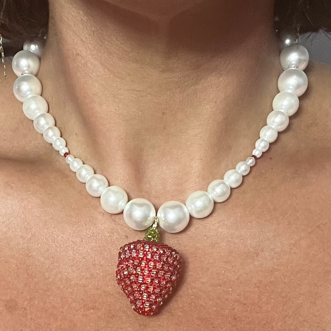 Graduated shell pearls, red seed beads, hand-beaded strawberry pendant.